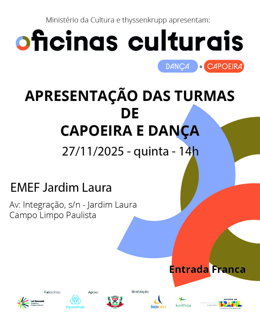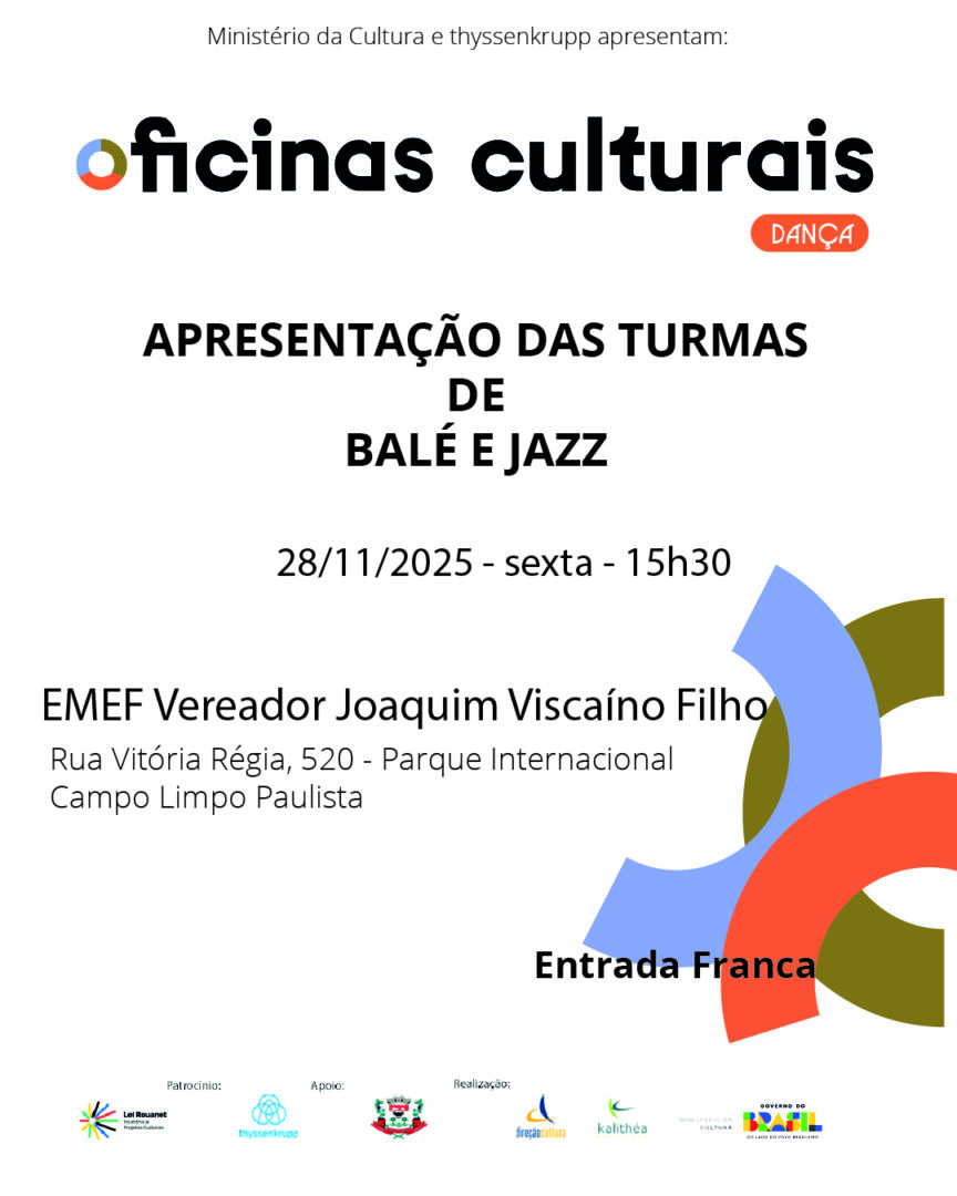 O projeto Oficinas Culturais encerra 2025 em grande estilo em Campo Limpo Paulista, cidade que abriga diversas modalidades artísticas e culturais. Com patrocínio da thyssenkrupp, por meio da Lei Federal de Incentivo à Cultura, as Oficinas Culturais oferecem aulas gratuitas de dança, balé e capoeira para alunos de três escolas públicas da cidade: E.E. “Frei Dagoberto Romag”, EMEF “Gov. André Franco Montoro” e EMEF “Ver. Joaquim Viscaino Filho”.