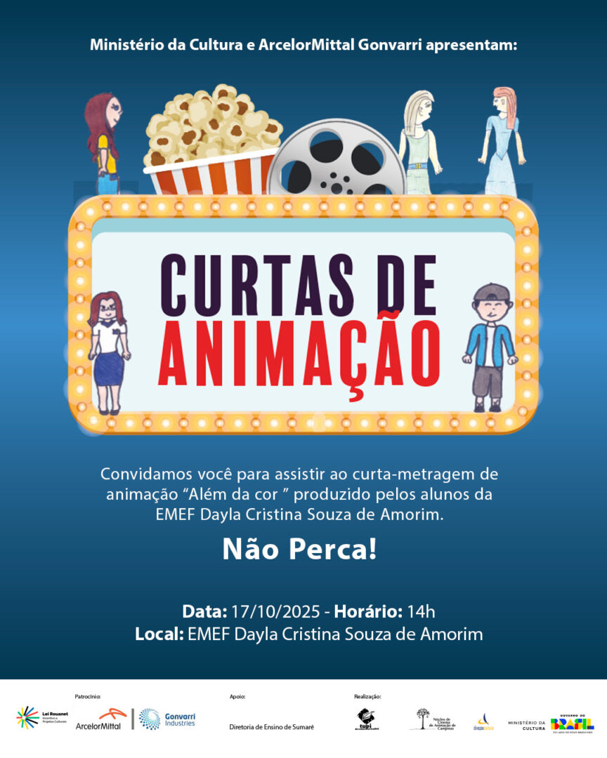 Encerrando a temporada de 2025 em Hortolândia, o projeto cultural Curtas de Animação, realizado pelo Núcleo de Cinema de Animação de Campinas em parceria com a Direção de Cultura, retorna à EMEF Dayla Cristina Souza, no Jardim Santiago, no próximo dia 17 de outubro. A visita tem como objetivo exibir, em primeira mão, o curta de animação “Além da Cor”, produzido por um grupo de estudantes da escola.