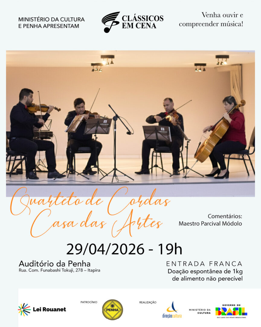 Em abril, o “Clássicos em Cena”, projeto que oferece mensalmente concertos gratuitos e comentados de música clássica e instrumental em Itapira, recebe um grupo da própria cidade, muito querido pelo público: o Quarteto de Cordas da Casa das Artes. A apresentação será no dia 29 de abril, às 19h, no anfiteatro do Grupo Penha, no Jardim Ivete.