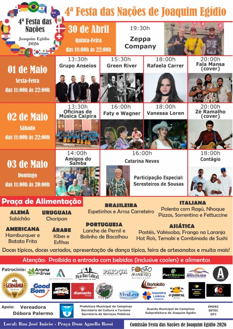 A Festa das Nações do distrito de Joaquim Egídio chega à quarta edição com programação diversificada, incluindo shows de sertanejo, pagode e pop rock, além de apresentações de danças típicas nos intervalos. Além das atrações musicais, o público terá acesso a comidas típicas e atividades voltadas a toda a família. A proposta é fomentar a convivência e ampliar o acesso à cultura na região.
